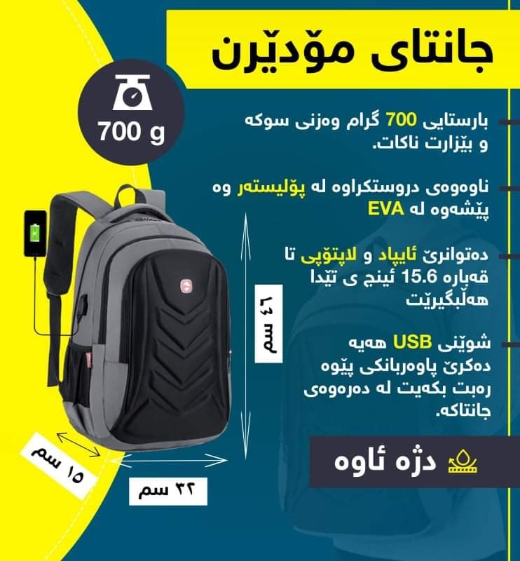 ▪️ئەم بەرهەمە گونجاوە بۆ قوتایبان، فەرمانبەران و مامۆستایان کە دەتوانرێ لاپتۆپ و کەلوپەلی ئۆفیسی تێدا هەڵبگیرێت.
