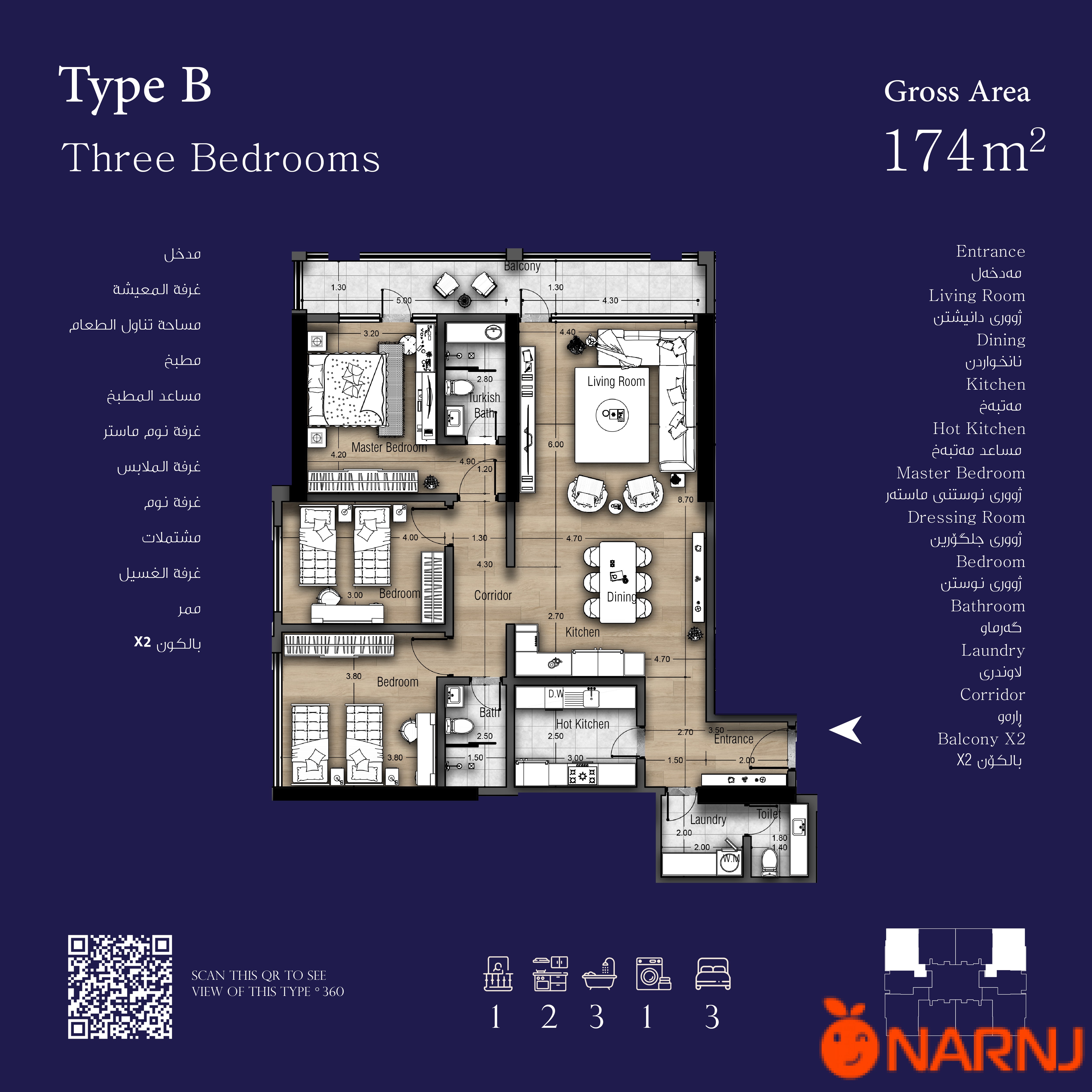 تایبەتمەندییەکانی شوقەی 174 مەتر دوجا: