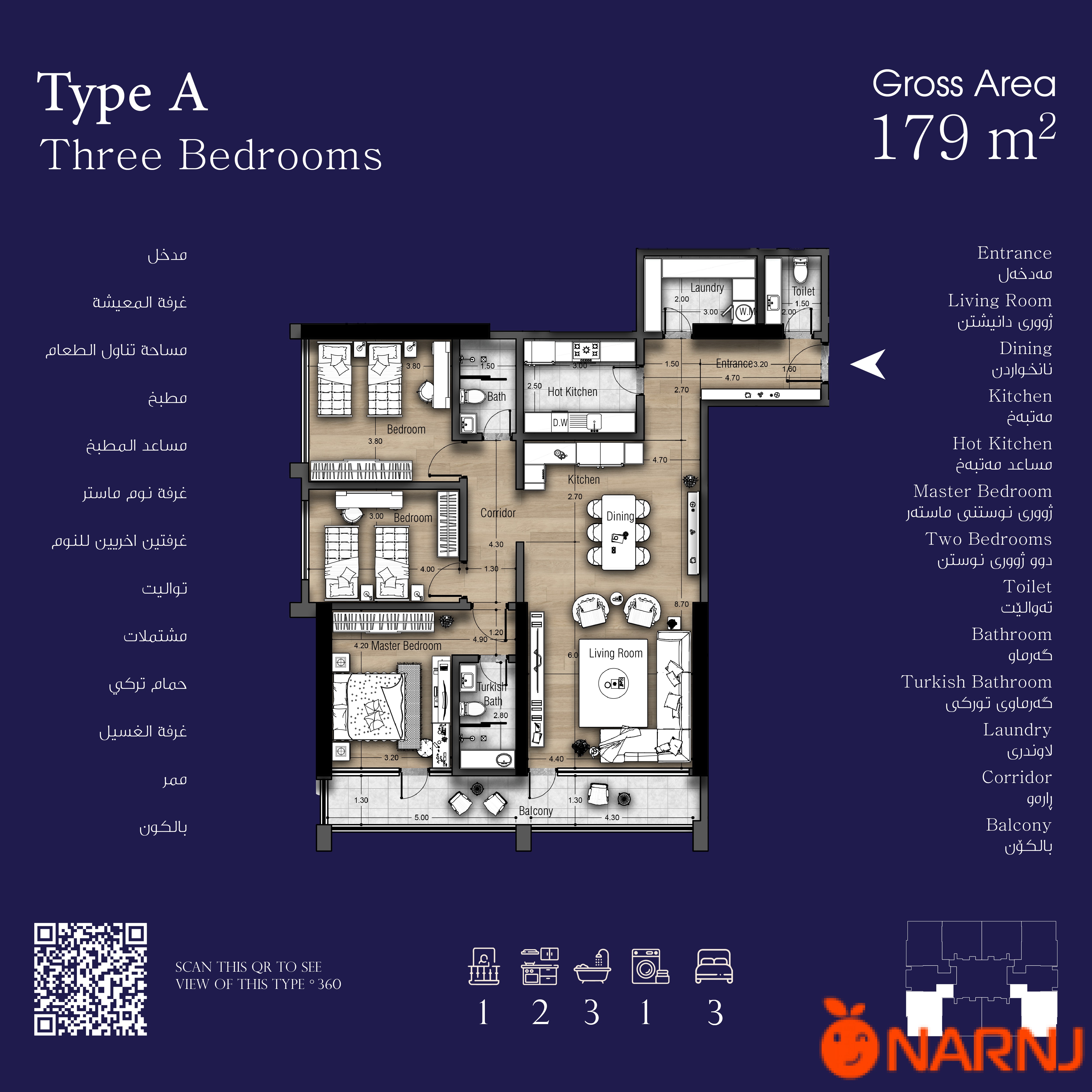 تایبەتمەندییەکانی شوقەی 179 مەتر دوجا: